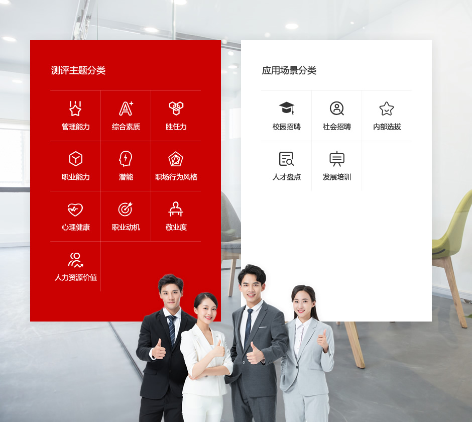 萬(wàn)保人力可為企業(yè)提供管理能力、勝任力、職業(yè)能力、潛能、職業(yè)動(dòng)機(jī)、行為風(fēng)格、心理健康等多種能力和素質(zhì)類測(cè)評(píng)內(nèi)容;適用場(chǎng)景涵蓋企業(yè)校園招聘、社會(huì)招聘、內(nèi)部選拔、人才盤點(diǎn)和儲(chǔ)備干部發(fā)展測(cè)評(píng)等;更能精準(zhǔn)為企業(yè)高、中、基層員工因崗量身制定測(cè)評(píng)方案,幫助企業(yè)精準(zhǔn)選擇崗位人才。
